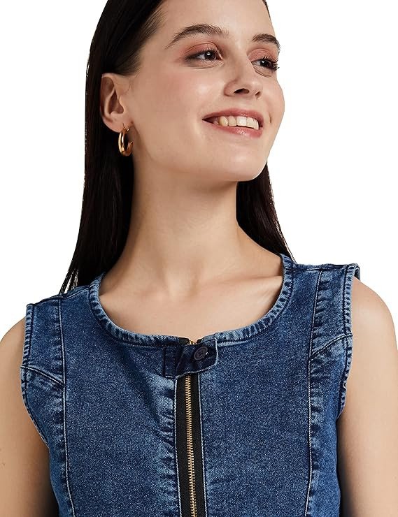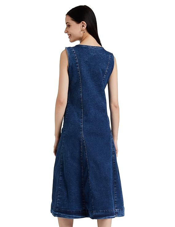 Amazon Brand - Symbol Skater Women's Denim A-line One Piece Midi Length Dress