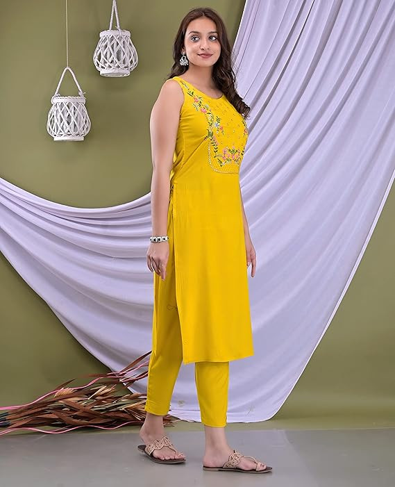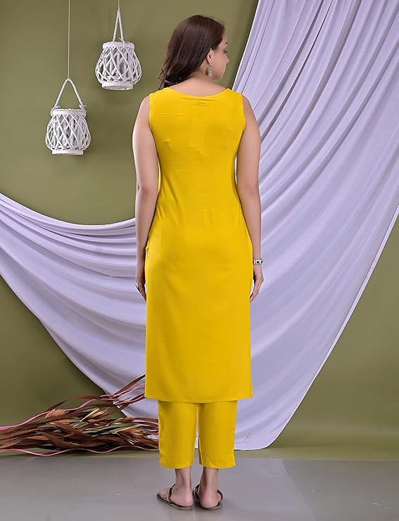 Clothy N Wave Women's Rayon Embroidered Mustard Kurta Pant set (KP135Musterd)