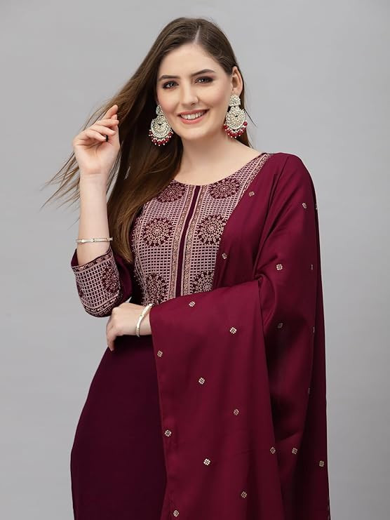 • ★ Product Material :- Viscose Slub || Colour :- Wine || Pattern :- Solid Embroidered