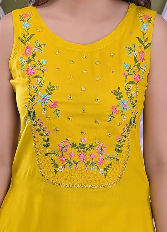 Clothy N Wave Women's Rayon Embroidered Mustard Kurta Pant set (KP135Musterd)