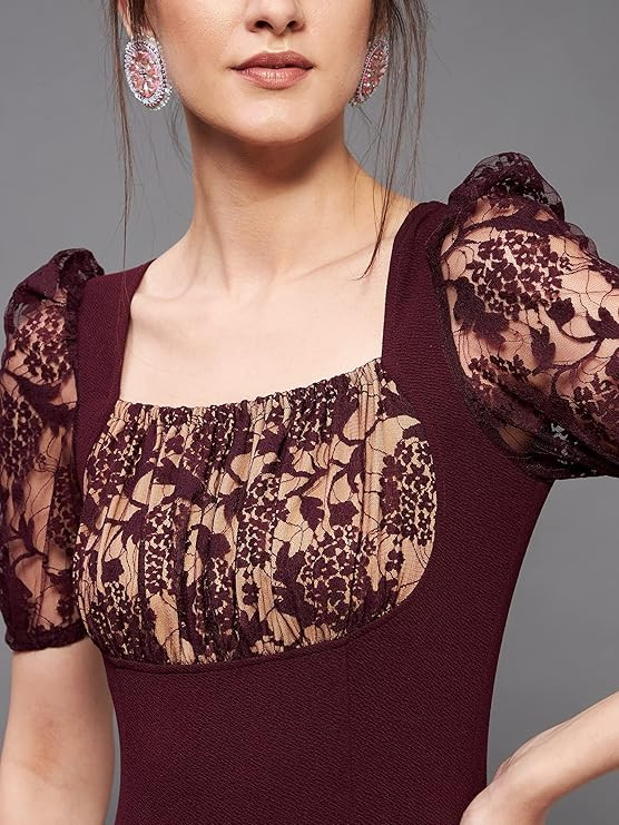 Miss Chase Women's Square Neck Puff Sleeve Solid Lace Overlaid Ankle Length Dress (Plus