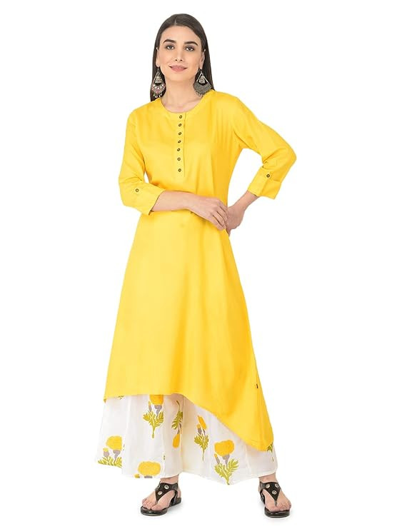 FEATURES & EXCELLENT FITTING :- KURTI :: Sleeves :-: 3/4th Fold-up Sleeve, Pattern : solid and printed, Boat Neck, Buttoned are fixed Not Openable, PALAZZO :: Stylish Printed Palazzo , Length : 38-39 Inches , Closer Type :: Drawstring (Pack Of : 1 Kurta 1 Palazzo )