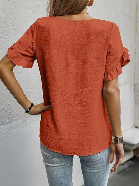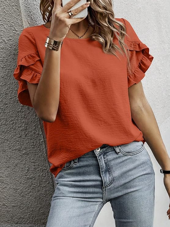 This top features unique tulip-style short sleeves with ruffle detailing, adding a touch of femininity and movement to your look.