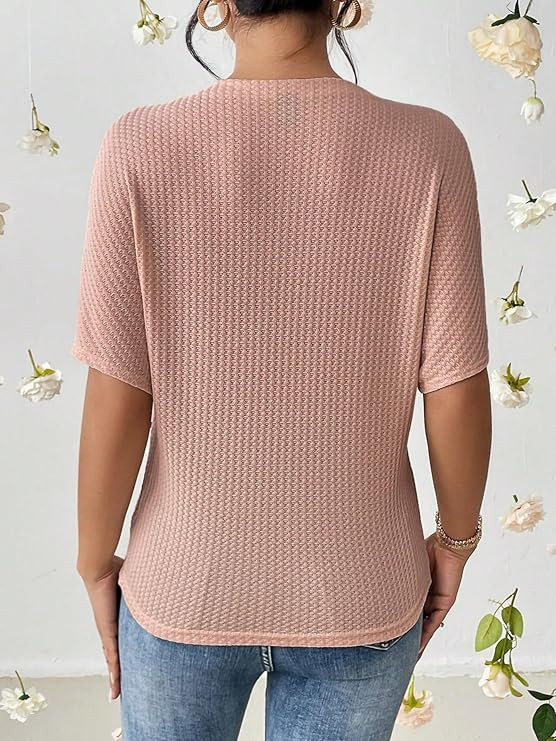 Features: this shift top shapes with classical Boat neckline, Batwing Half sleeves, waffle (cotton) materail, a relaxed bodice that falls into a straight hemline!